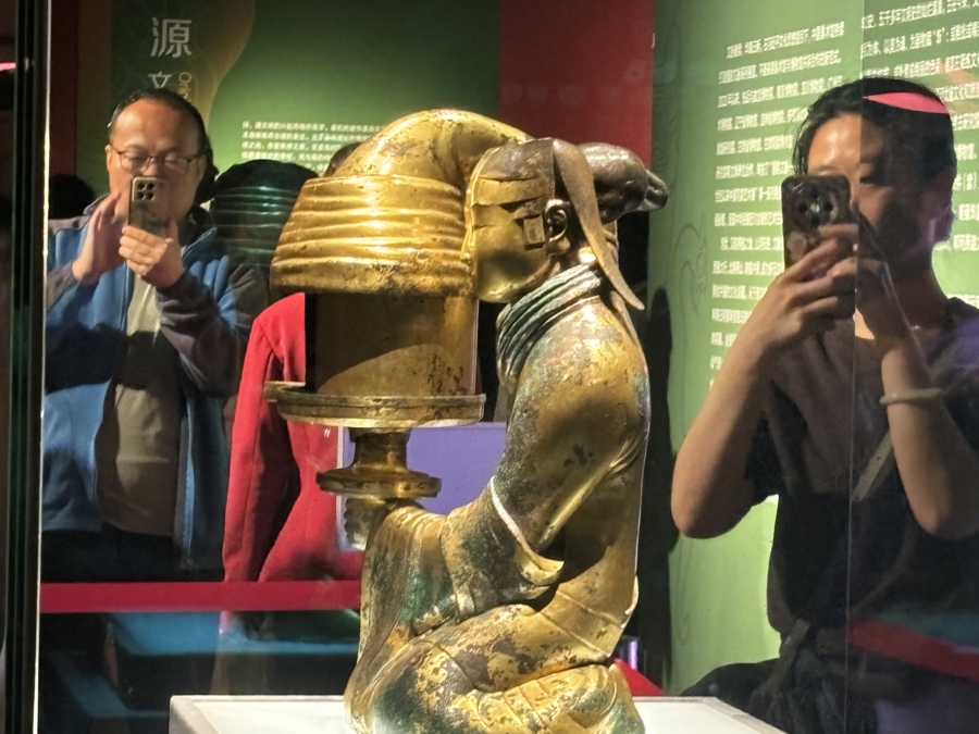 4月18日一早,中国美术馆外已排起长龙,沿台阶一路蜿蜒至五楼展厅入口,观众不时踮脚张望,只为一睹“中华第一灯”——长信宫灯的风采。这件来自河北博物院的国宝级文物此次赴京“出差”,让已展出多时的“饰文焕彩——河北古代艺术珍品展”再度升温。作为一件兼具实用巧思与审美意趣的灯具,长信宫灯不仅是汉代宫廷生活的注脚,也与展览中的其他文物一道,诠释着因“用”而生的器物,如何承载古人对美的追求与创造。